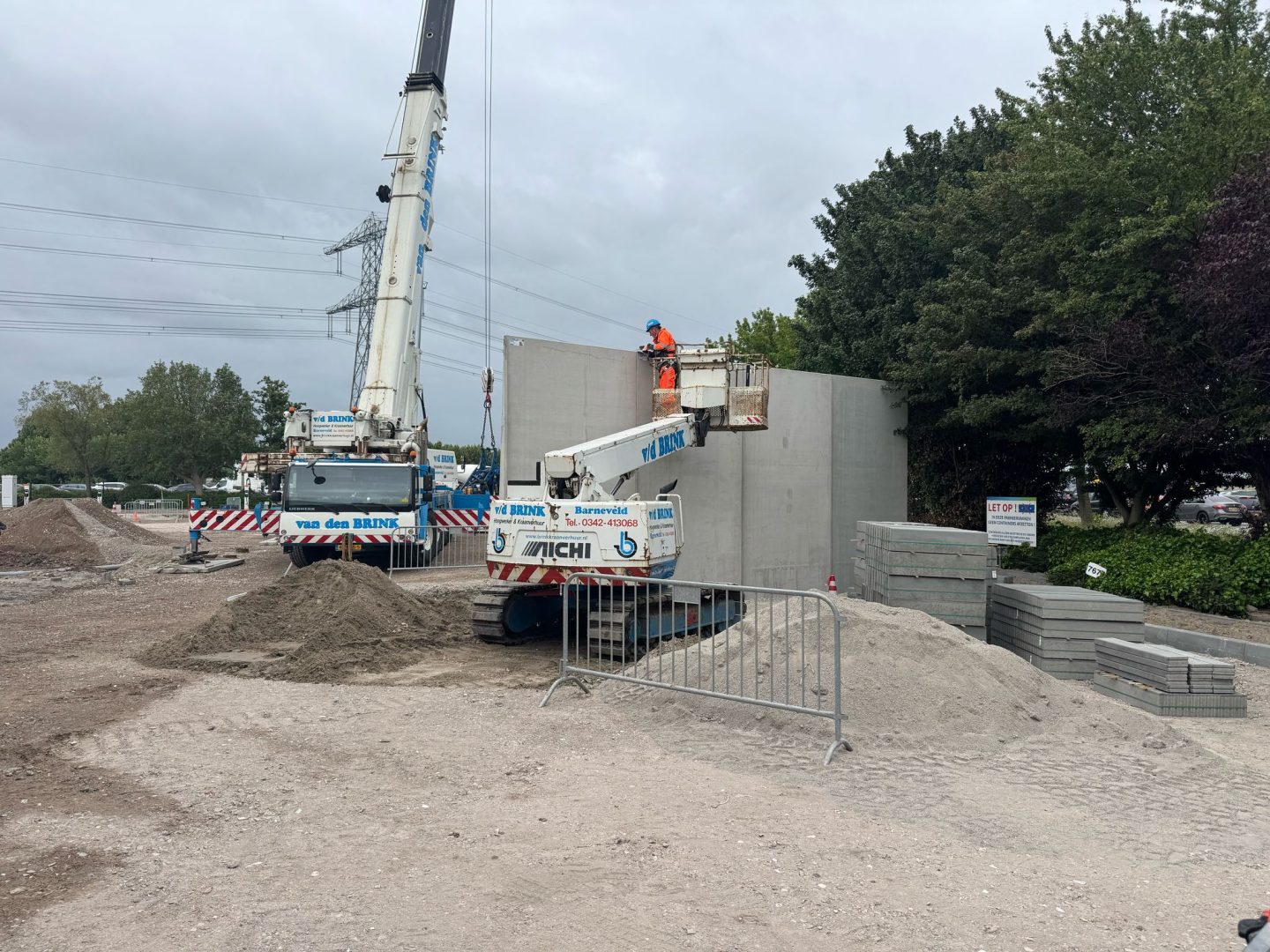 Støttemurene tjener som en afgrænsning af byggepladsen i distributionscentret hos grillproducenten Napoleon Grills i Tiel.